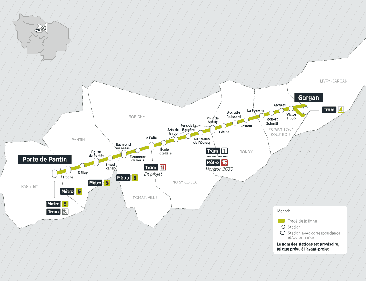 Il traversera 8 communes : Paris 19 ème , Pantin, Bobigny, Romainville, Noisy-le-Sec, Bondy, Livry-Gargan et Pavillons-sous-Bois.