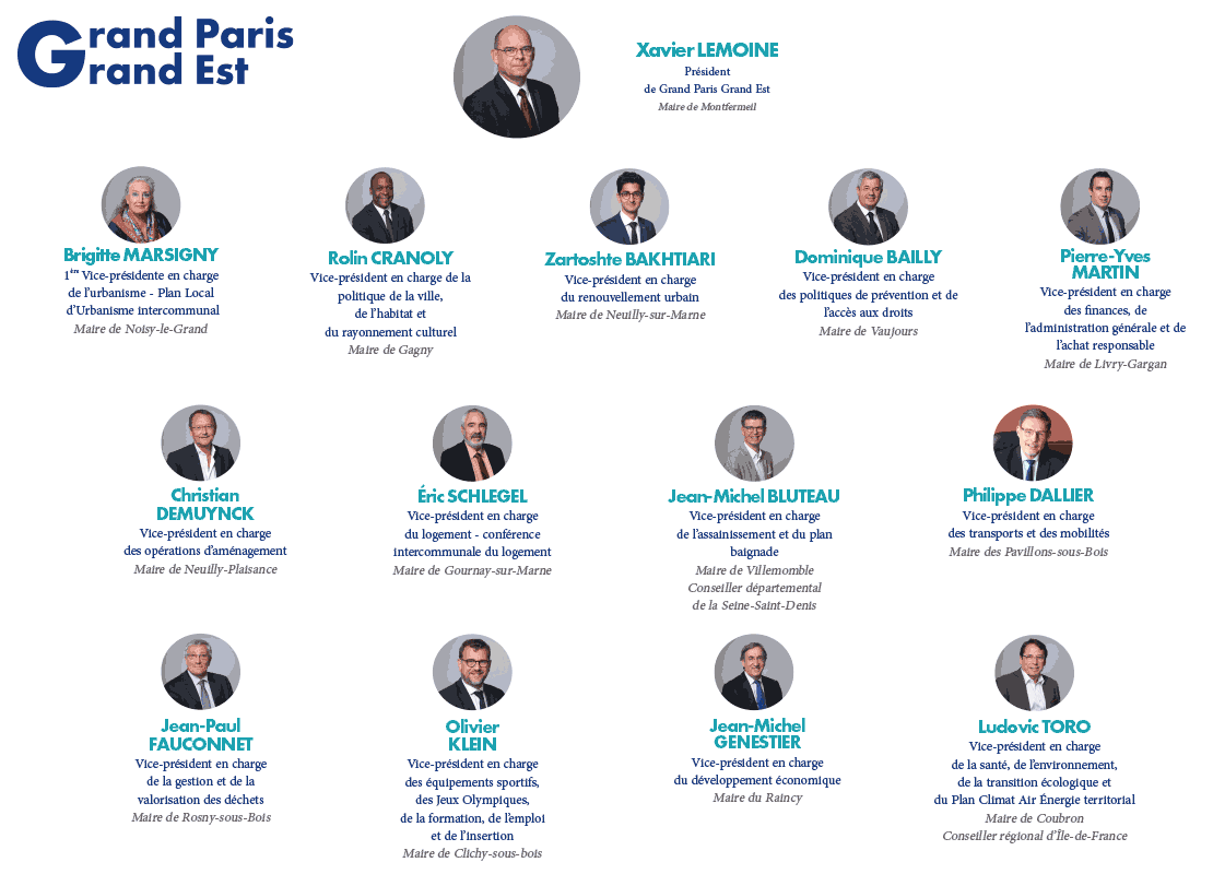 Le Bureau est l’organe exécutif de Grand Paris Grand Est. Il se compose du Président et des 13 Vice-présidents, maires des 14 communes du territoire.